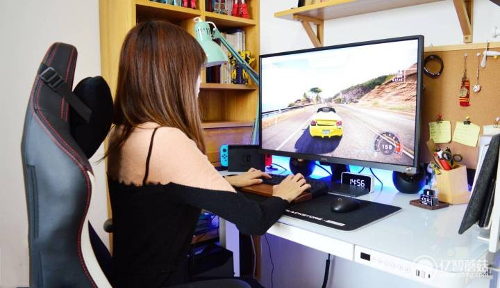 首先就是尺寸方面,由于目前使用的书桌已经略显拥挤,之前在购买这款显示器前还在担心会不会因为屏幕太大占地方,实际将显示器摆上书桌后发现尺寸还是挺合适的,不会出现空间局促的现象,另外相比于造型浮夸的电竞显示器,小泽还是更喜欢这种外形简约的款式。
