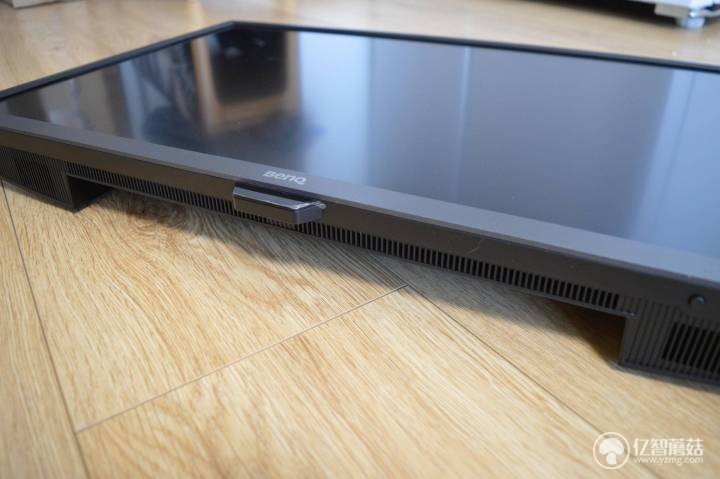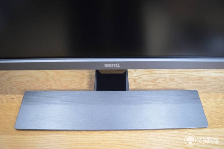 边框使用了磨砂烤漆工艺,金属漆质感的表面搭配深灰配色给人一种很高级的感觉。对logo下方的小下巴一开始还比较好奇,查询了一下,原来这款显示器支持明基自带专利的智慧爱眼B.I.+智慧调光功能,小下巴内置了光线感应模块,能够根据当前使用环境的光线自动调节显示器亮度已经色温,达到人眼做舒服的状态,换句话说也就是显示器的眼睛。