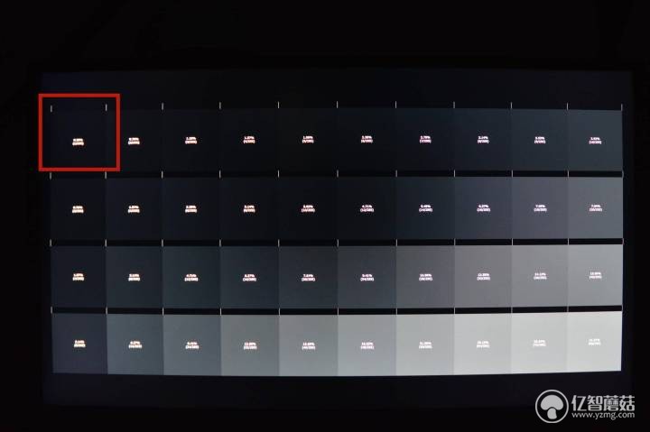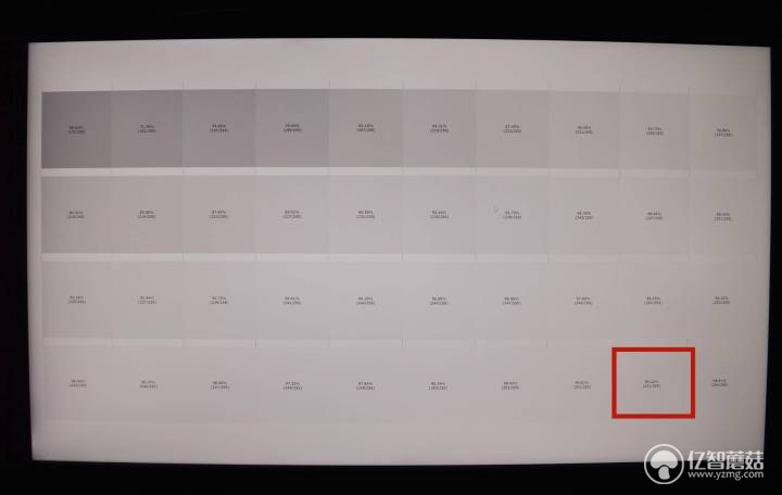 在灰阶测试下的浅色背景中,显示器可以用肉眼隐约区分底部底部99.22%色块的边缘。