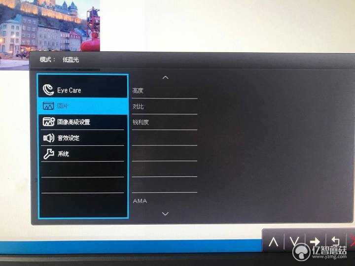 OSD菜单采用了比较传统的按键形式,习惯了之后很容易上手,在功能设置菜单中可以对亮度,对比度,分辨率,使用模式进行参数方面的调整,功能功能选项达不到专业级别但也足够应对日常使用。
