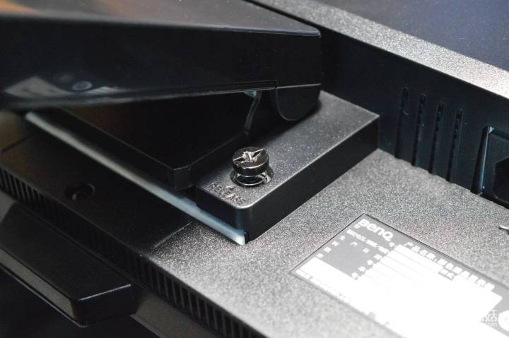 在支架与屏幕的结合点有一处人性化的小设计,螺丝内部使用了弹簧结构进行链接,因此是无法取下的,将支架推入屏幕上的滑槽,再讲螺丝拧紧就可以完成安装了,这么做能够避免螺丝丢失,怪不得没有在全家福中发现配件包!