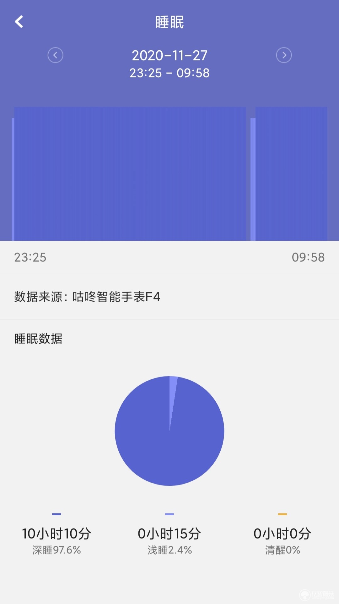 F4智能手表配备陀螺仪监测以及心率监测传感器,在实际睡眠佩戴过程中,根据手腕动作幅度和频率健来衡量睡眠质量。在浅度睡眠阶段,陀螺仪监测动量会有增加,在深度睡眠时,陀螺仪动量基本可以忽略从而被手表判定浅度深度睡眠,最终分析出睡眠质量的优良程度。