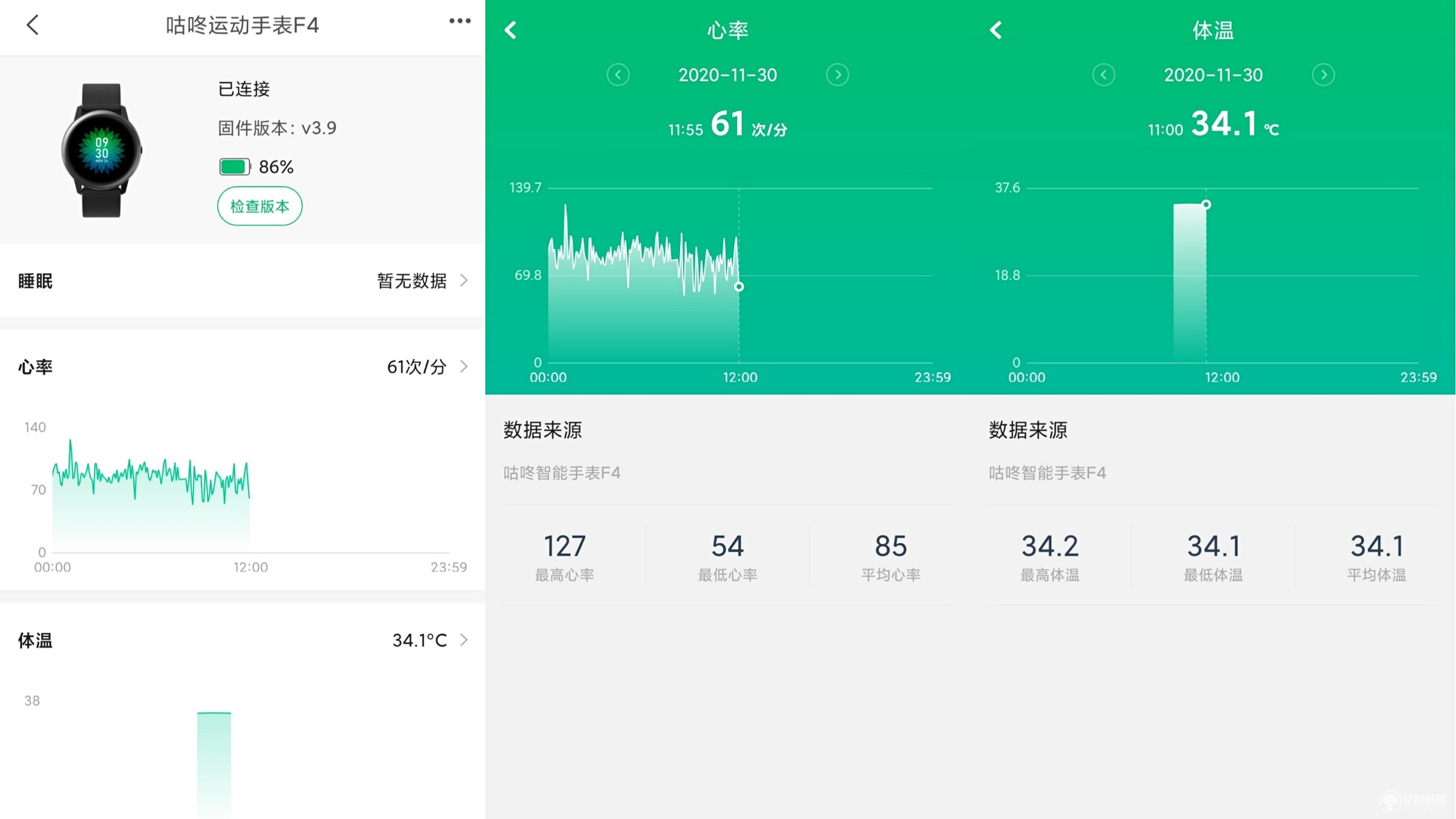 除了常规功能外,咕咚智能手表F4顺势而为加入了体温测量功能,在疫情进入常态化防控阶段及运动中自我对温度变化的基础需要,F4智能手表搭载体温传感器,可全天候测量体温,在“咕咚”APP端可了解佩戴者自身体温变化,在体温异常时,手表端实时报警。温度测量与常规额部测温枪精度做出对比,数据基本一致。