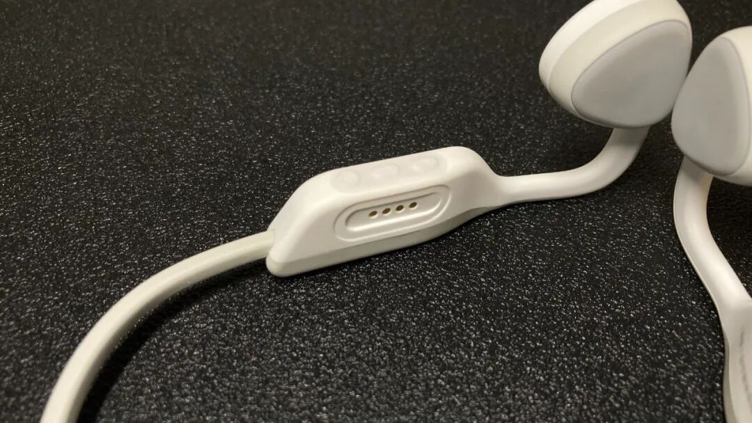 耳机的充电接口位于右侧,磁吸式的设计也将耳机整体的防水性能提升了一个台阶,IPX8的防水等级完全不用担心汗水和雨水的侵蚀,耳机底部配有三颗实体按键(电源、音量+-),操作逻辑也非常简单,易上手,耳挂式的设计增强了佩戴时的稳定性,无论跑步、骑行还是游泳,均可以做到狂甩不掉的效果,更加适合运动佩戴。