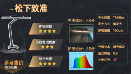 十大护眼台灯品牌排行榜前十名有哪些?松下致准光线上配备了加宽的矩形柔光面板,再结合内置扩散透镜,光线折射后较为柔和且能覆盖大约1.8米的桌面区域,适合较大书桌使用。但它的灯头与灯臂就靠单轴承连接,不能左右旋转,角度调节有局限,边缘区域可能出现轻微明暗差。护眼上它在430nm左右出现多个在0.8附近尖锐的蓝光峰值,这属于高能短波蓝光的集中区域,在千元台灯中它的蓝光表现中规中矩,而且光谱中红光波段占比偏低,长时间用眼还是容易产生疲劳感。