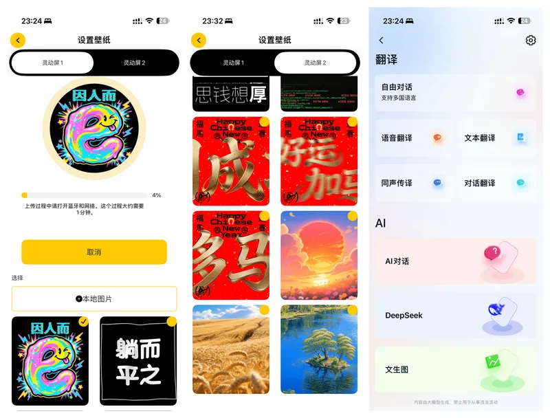 南卡Show连接上APP之后,可以设定屏幕控制,壁纸自定义,EQ设定,听歌模式的切换,更有AI玩法,接入了DeepSeek,双AI引擎集成讯飞+ DeepSeek多模态 AI 模型,唤醒 “小南小南” 即可实现,能AI对话、实时翻译、语音对话、内容创作辅助;音乐控制、消息播报、日程提醒;配合灵动屏,实现拍照遥控、视频快切,内容创作者拍视频、拍vlog超方便。